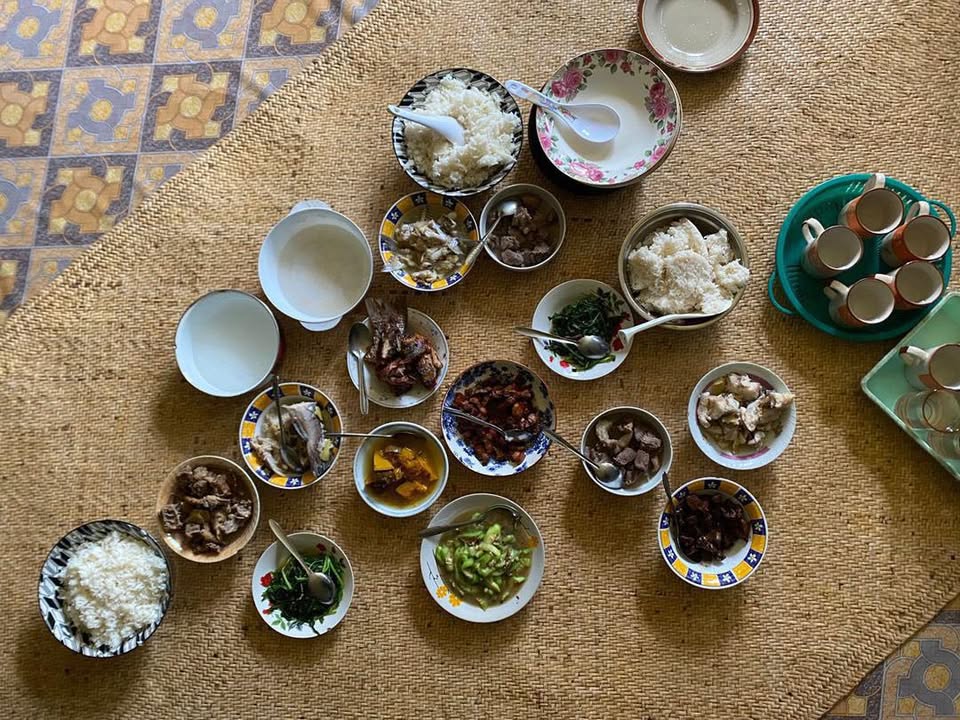 摆设简单直接。一些坐沙发,一些席地而坐,纯朴的食物,一定有自酿米酒。