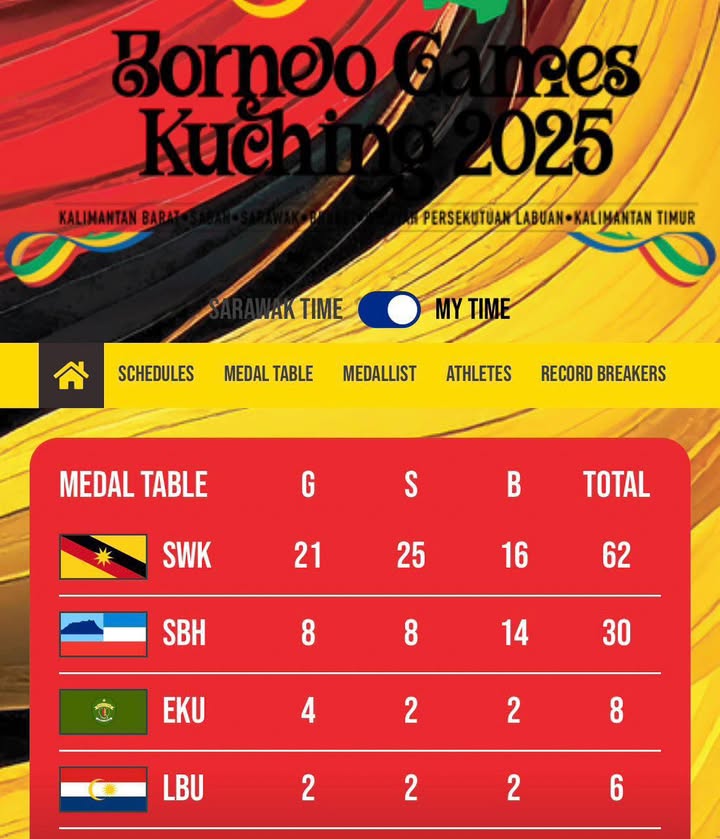 砂拉越的金牌数量目前位居榜首(21枚),沙巴排名第二(8),东加里曼丹排在第三(4)。