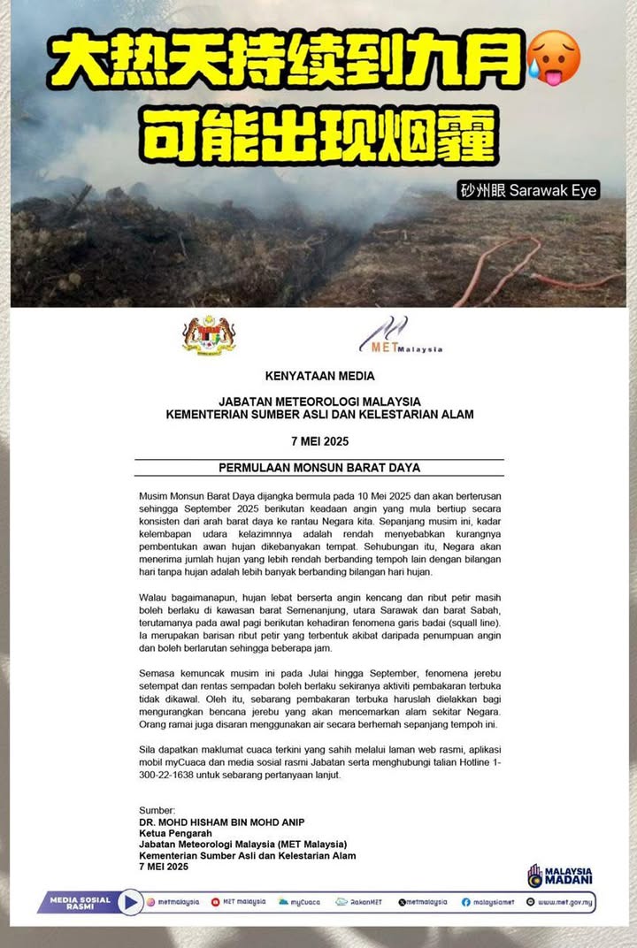 气象局也警告,在7月至9月季候风的高峰期,如果出现露天焚烧活动,将出现烟霾现象。