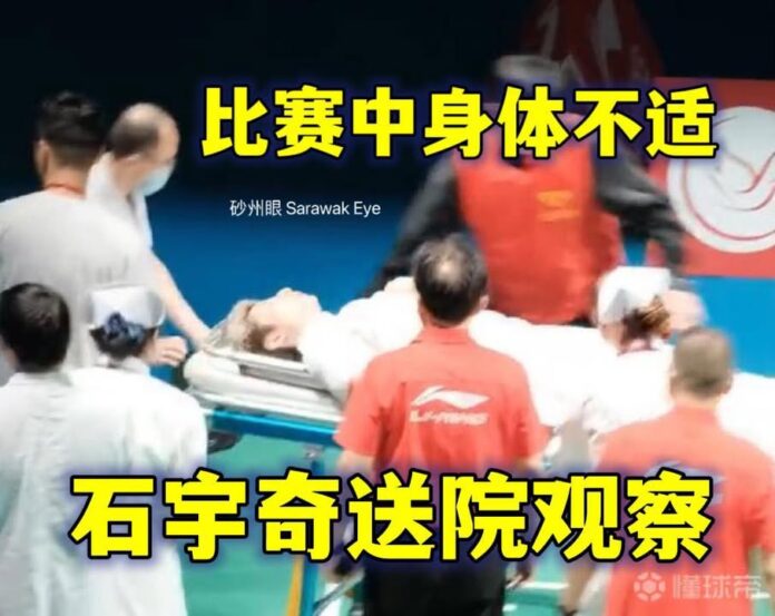 比赛进行一半,石宇奇呼吸突然急促,随后被担架抬下。