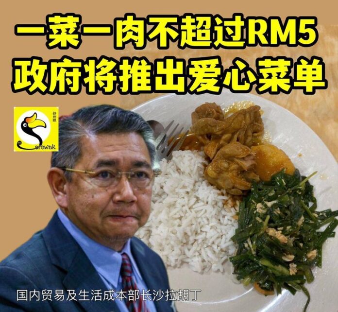 国内贸易及生活成本部宣布政府将推出“爱心菜单”(Menu Rahmah),一碗饭、一个肉(鸡或鱼)、一个菜,不超过5块钱,特别为赤贫群体提供。不知道砂拉越这边什么时候会有呢?