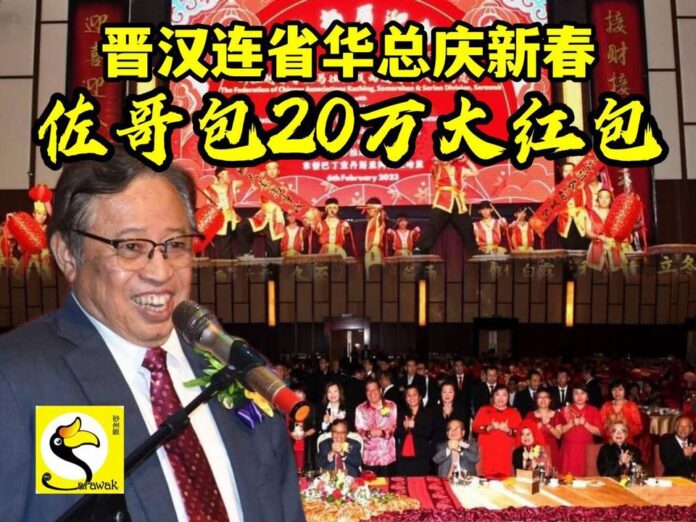 虽然过了元宵节,华人新年的庆祝正式告一段落,但不少社团还在举行新春联欢会。昨晚是晋汉连省华总吃团圆饭,请来了砂总理Datuk Patinggi Abang Jo,给他看南北舞狮和廿四节令鼓。