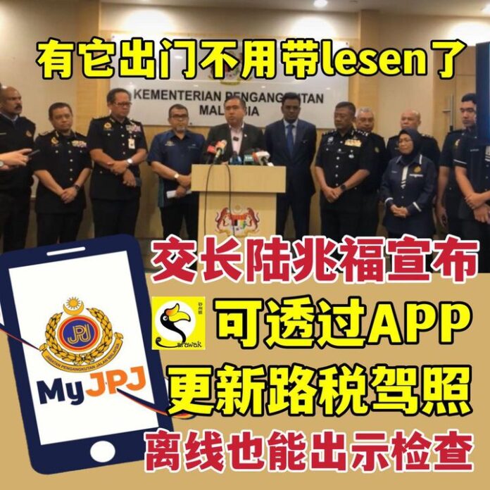交通部长陆兆福今早召开记者会,宣布以后大家可以下载MyJPJ手机应用程序来更新路税和驾照,而且在离线状态(offline)下也可以显示路税和驾照信息。