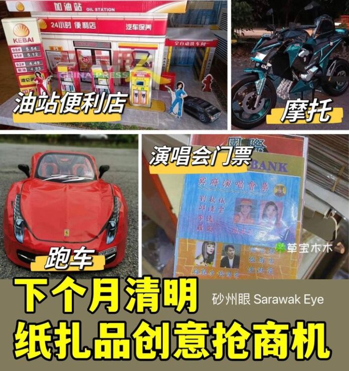 Home新闻快报下个月清明,纸扎品创意抢商机 新闻快报 下个月清明,纸扎品创意抢商机 By sarawakeyeadmin March 16, 2023 0 580 Share FacebookTwitterPinterestWhatsApp 【砂拉越16日讯】下面也有演唱会可以看了 过世的亲人也要给他们最好的,很多人在清明节准备纸扎祭品烧给先人,包括日常用品、电子产品、各种好吃的、香烟啤酒麻将也都有,让先人在下面也有娱乐生活,跟上潮流。 现在连演唱会门票都有了,开唱歌手包括邓丽君、梅艳芳、张国荣、张雨生这些已经过世的大牌明星。 纸扎跑车也是层出不穷,做得越来越像真的了……还有银行、油站。你们还见过什么创意祭品? 今年清明节落在4月5日,多少人已经买了回乡扫墓的机票? 链接至面子书帖子 Share FacebookTwitterPinterestWhatsApp Previous article外国人来马开演唱会的指南Next article登记局迁出砂中央医院,不再协助办理出生/死亡证 sarawakeyeadminhttps://sarawakeye.my 相关文章 新闻快报 沙巴的大选才刚刚结束 December 5, 2025 新闻快报 新加坡总理黄循财宣布 December 4, 2025 新闻快报 哇 December 3, 2025 - Advertisment - 最受欢迎 沙巴的大选才刚刚结束 December 5, 2025 新加坡总理黄循财宣布 December 4, 2025 哇 December 3, 2025 AirBorneo婆罗洲航空正式明年1月启航 December 2, 2025 Load more