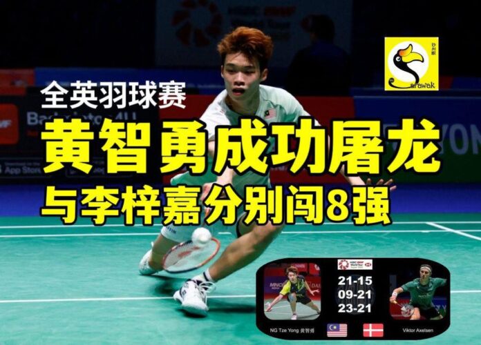 【柔佛17日讯】大马男单羽球选手黄智勇再次展现出他的无限潜能!继之前在英国伯明翰举行的共运会打败新加坡世界冠军骆建佑拿下银牌,这一次的全英赛他拿下丹麦选手安赛龙闯入8强,成功”屠龙“!