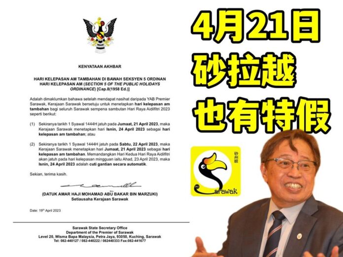 Home新闻快报4月21日,砂拉越也有特假 新闻快报 4月21日,砂拉越也有特假 By sarawakeyeadmin April 19, 2023 0 469 Share FacebookTwitterPinterestWhatsApp 【砂拉越19日讯】最新宣布,砂拉越也有开斋节特假。 和首相安华的宣布一致,砂政府发出文告表示4月21日是开斋节的特假。 如果4月21日宣布为开斋节第一天,则4月24日是特假。 链接至面子书帖子 TagsRaya开斋节 Share FacebookTwitterPinterestWhatsApp Previous article美里大伯公庙,7米高神像安装成功Next article开斋节前后,货运车4天禁上路 sarawakeyeadminhttps://sarawakeye.my 相关文章 新闻快报 沙巴的大选才刚刚结束 December 5, 2025 新闻快报 新加坡总理黄循财宣布 December 4, 2025 新闻快报 哇 December 3, 2025 - Advertisment - 最受欢迎 沙巴的大选才刚刚结束 December 5, 2025 新加坡总理黄循财宣布 December 4, 2025 哇 December 3, 2025 AirBorneo婆罗洲航空正式明年1月启航 December 2, 2025 Load more