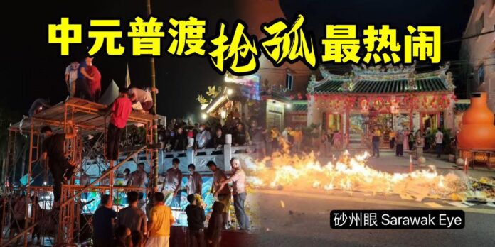 古晋寿山亭大伯公庙昨晚也一起庆祝地藏王菩萨圣诞,寺庙根据过往的传统搭起12尺高的高台展开抢孤活动,才一下祭品就被大家抢光了。