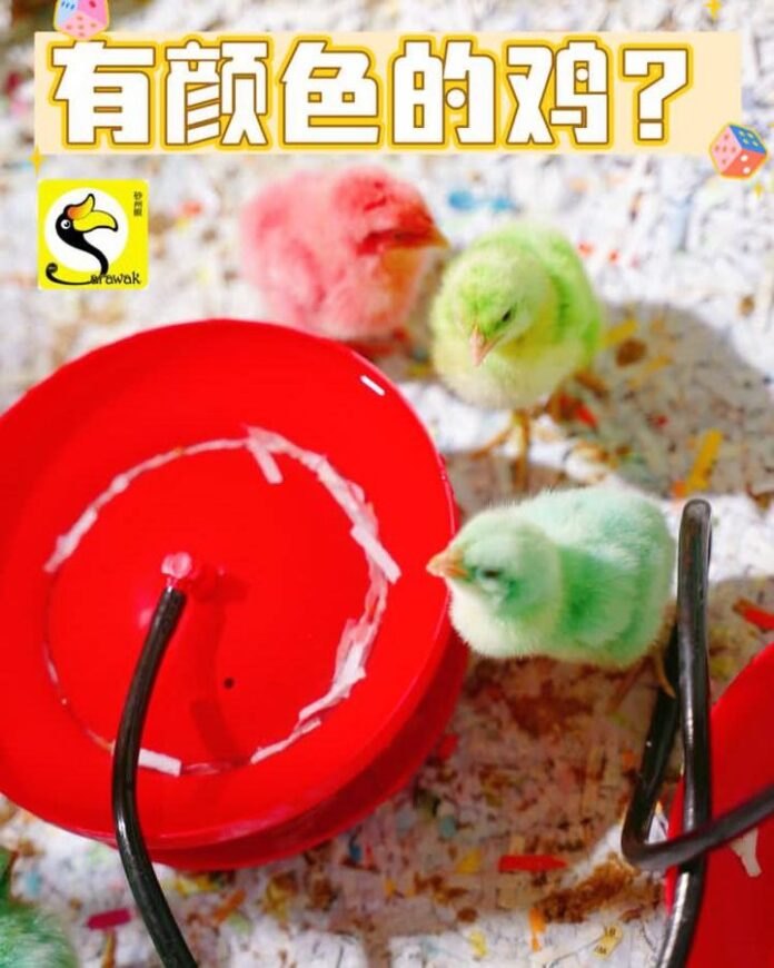 据说这些鸡仔在还是鸡蛋时就注射了色素,所以破蛋而出时是五颜六色的,等到换毛期掉毛,就会变回“小黄鸡”了。