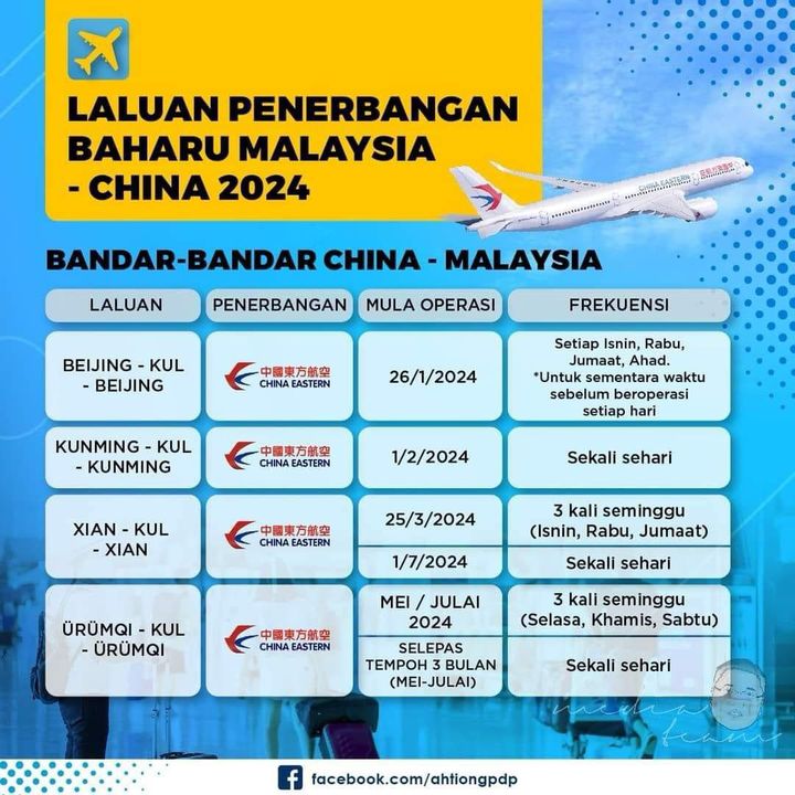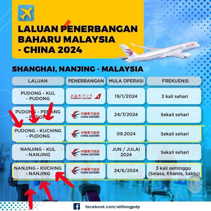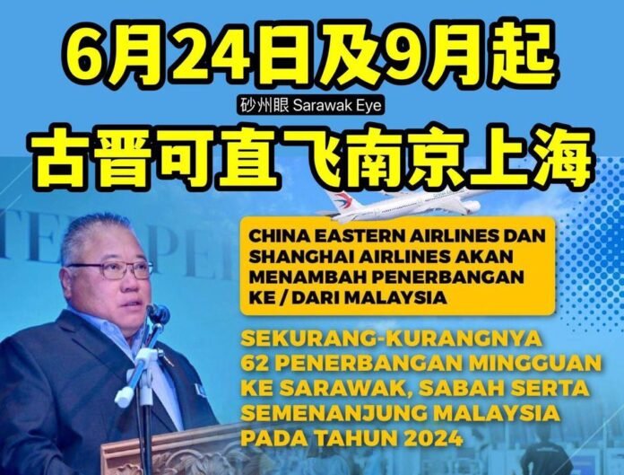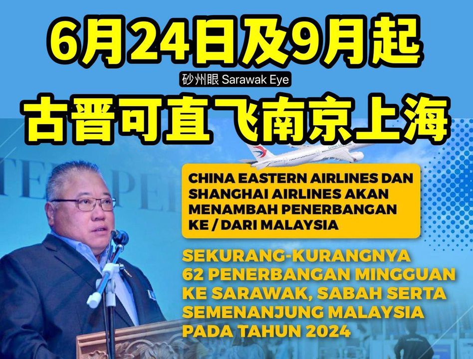 Home新闻快报古晋可直飞南京上海 新闻快报 古晋可直飞南京上海 By sarawakeyeadmin January 5, 2024 0 126 Share FacebookTwitterPinterestWhatsApp 【古晋5日讯】今年去中国不只免签证,下半年还可以从古晋直飞中国咯,大家最希望的就是这两条直飞航线可以“长长久久” 联邦旅游、艺术及文化部长,也是民都鲁国会议员的张庆信在FB透露,今年6月24日起,中国东方航空公司开辟马来西亚新航线,推出南京往返古晋的直飞航班,一周三趟。 接着今年9月多,上海浦东和古晋的直飞航班也会起航,而且是每天一趟。 东方航空,应该很多人都没搭过吧?到时再看看直飞的机票价格是不是很亲民 链接至面子书帖子 Share FacebookTwitterPinterestWhatsApp Previous article亚航春节深夜机票Next articleTabuan Desa狗狗疑出现狂犬病症状 sarawakeyeadminhttps://sarawakeye.my 相关文章 新闻快报 马中公园烟花秀 配合马中建交50周年活动 May 31, 2024 新闻快报 中马建交50周年礼物 入境免签增至30天 May 31, 2024 新闻快报 Gawai遇上Agong诞辰 砂迎来四天连假 May 30, 2024 - Advertisment - 最受欢迎 马中公园烟花秀 配合马中建交50周年活动 May 31, 2024 中马建交50周年礼物 入境免签增至30天 May 31, 2024 Gawai遇上Agong诞辰 砂迎来四天连假 May 30, 2024 古晋现插针鸡蛋害狗,屋主警惕入室盗窃 May 30, 2024 Load more