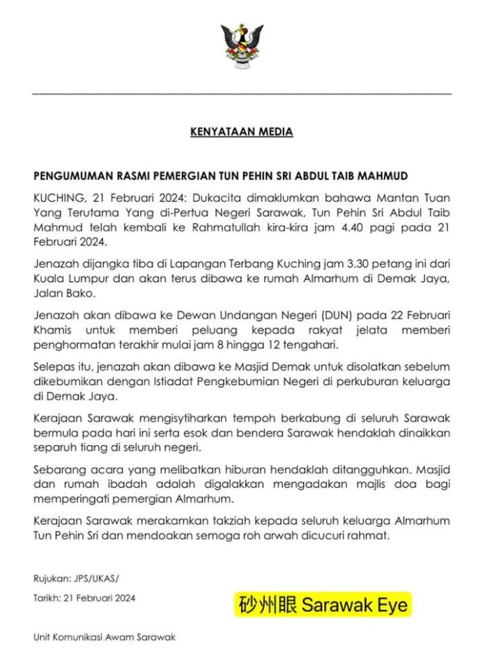前砂元首敦泰益玛今天凌晨去世,砂政府已经宣布,所有砂拉越旗帜今明两日下半旗哀悼,官方娱乐活动也需展延进行。