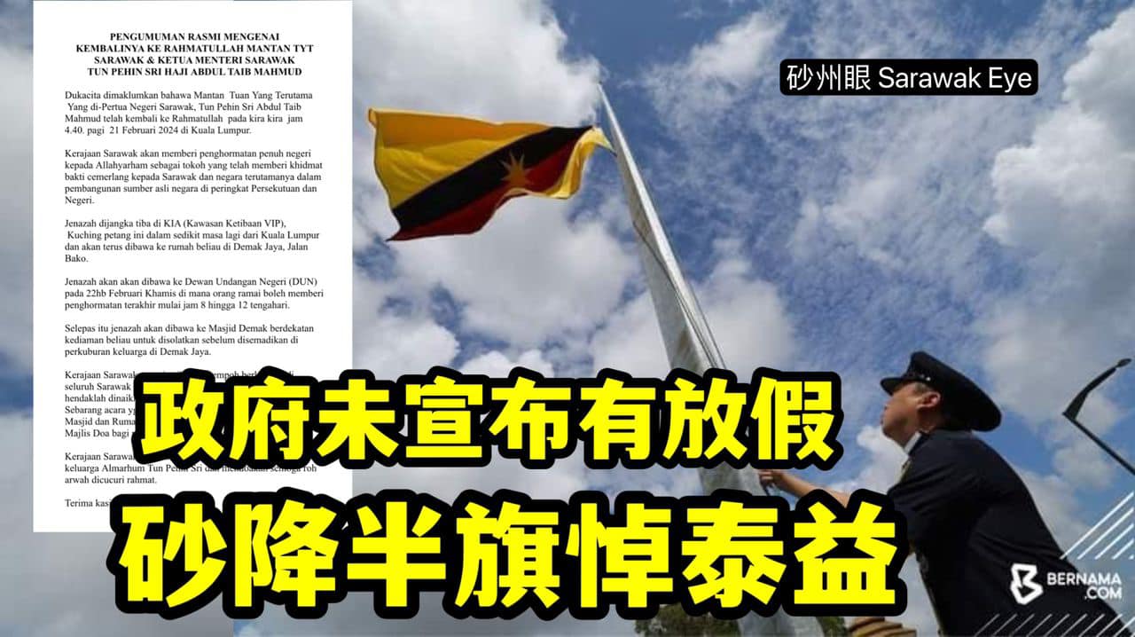 砂拉越政府也宣布下半旗全砂哀悼两天。不能有官方娱乐活动,虽然私人活动不受影响,不过很多团体机构基于对敦的尊敬,所以这两天很多元宵活动及游行已临时取消并展延举行。
