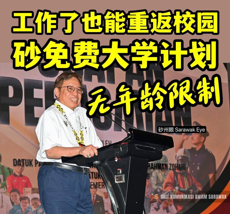 砂拉越人免费读大学,又有更详细的宣布。砂总理Abang Jo表示,只要身份证有K,就算是60岁,也可以活到老学到老,免费教育不只是应届生的福利。