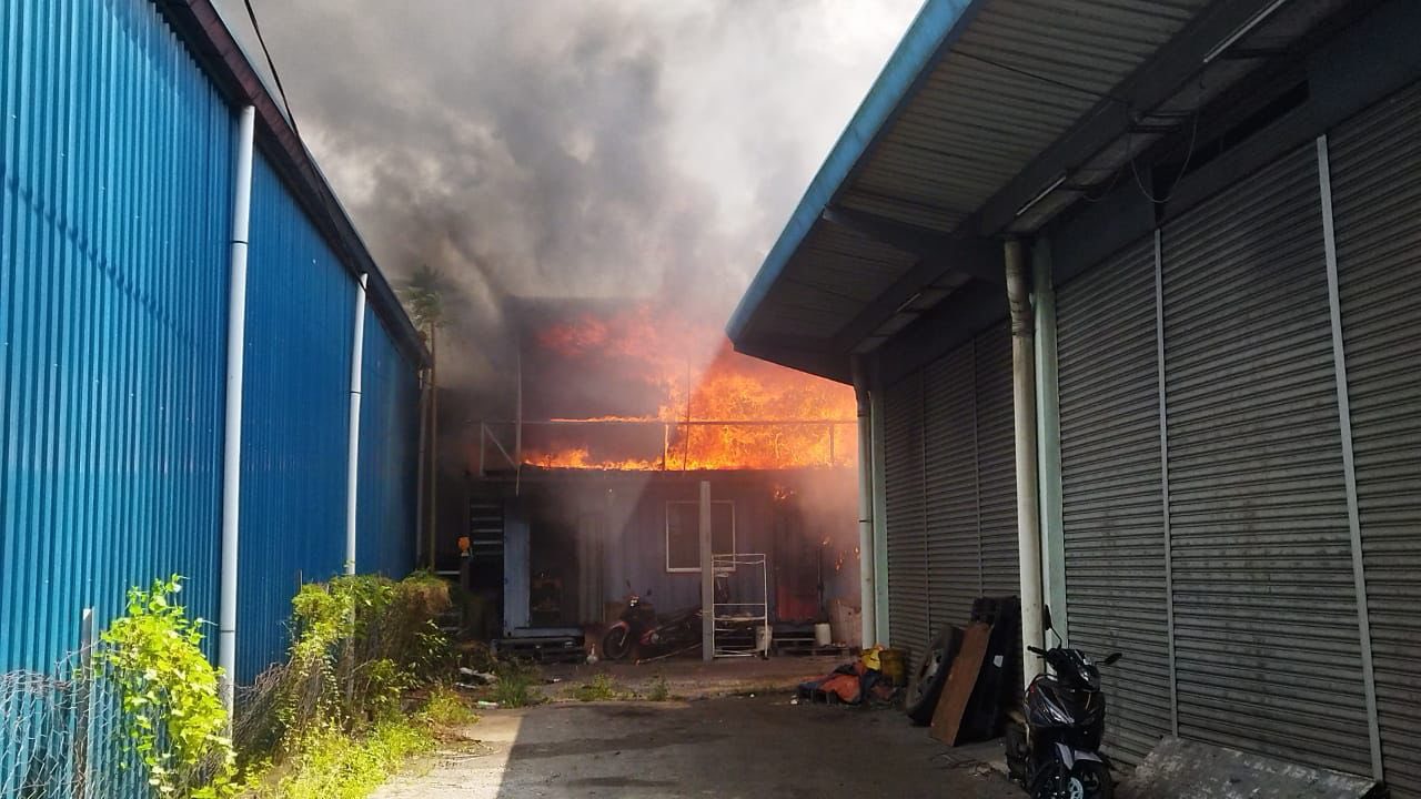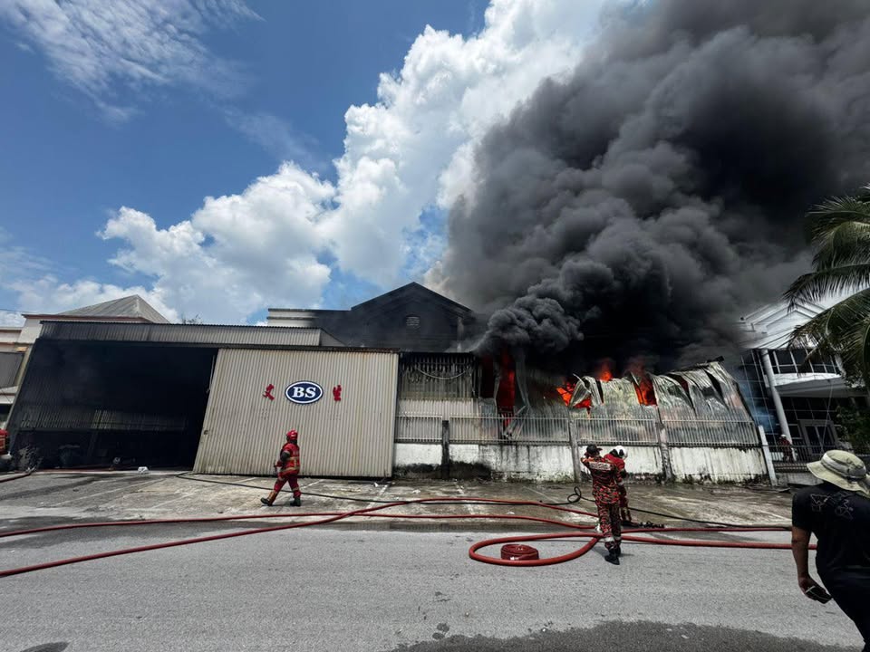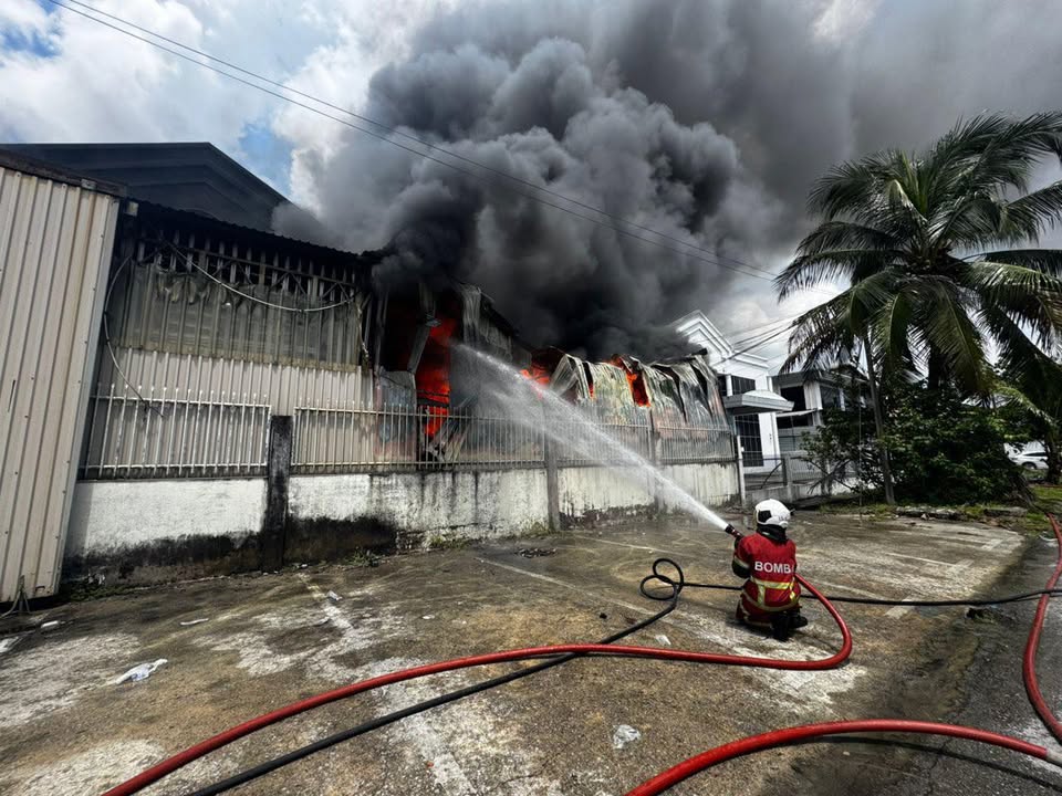 Muara Tabuan工厂发生大火,现场冒起滚滚浓烟,消防队伍正努力灭火中。