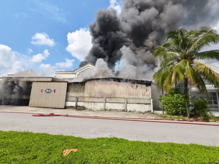 Muara Tabuan工厂发生大火,现场冒起滚滚浓烟,消防队伍正努力灭火中。