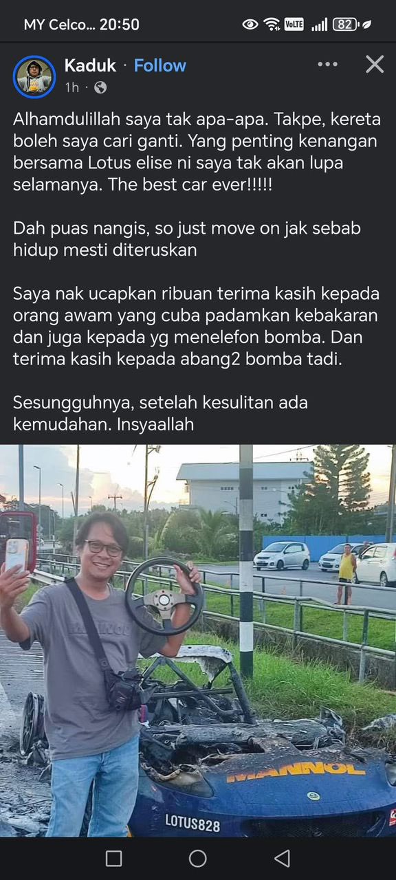 Lotus elise车主是一个小有名气的马来网红,也有代理汽车产品。他说万幸人没事,车子再找一辆替代。虽然会难忘与它曾经的陪伴,2018-2025,但哭完了,生活必须前进。