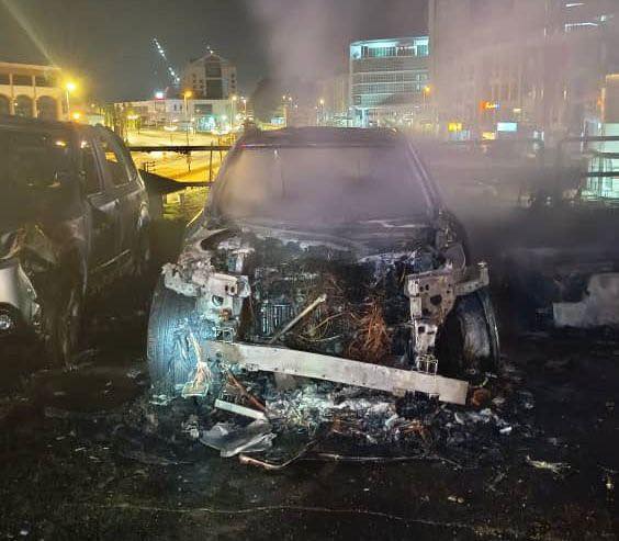 火灾涉及一辆 Volvo,一辆Subaru轿车,烧毁程度都很严重,万幸的是没有蔓延到其他车辆,建筑物也没事。消防队灭火到天光。