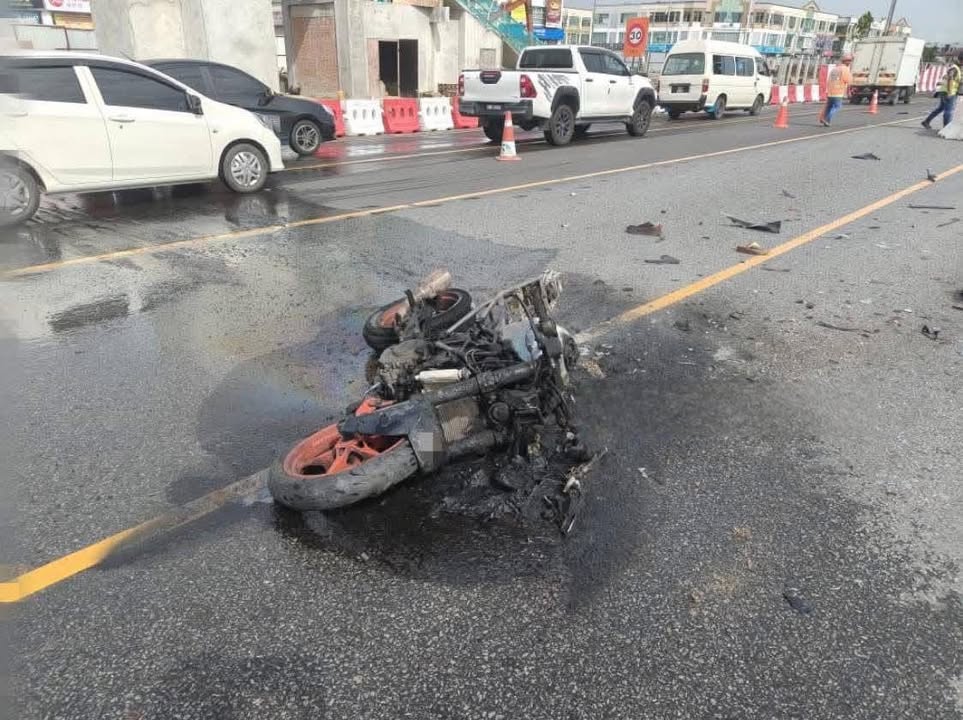 摩托车随后也起火燃烧。摩托骑士则受伤入院。